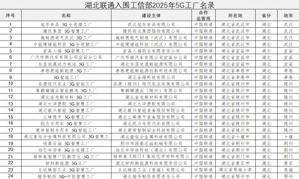 湖北省本次共有46个5G工厂项目入选名录,湖北联通贡献的24个项目覆盖医药、高端制造、现代农业等多个关键领域,这意味着全省每两个5G工厂中就有一个由湖北联通赋能。