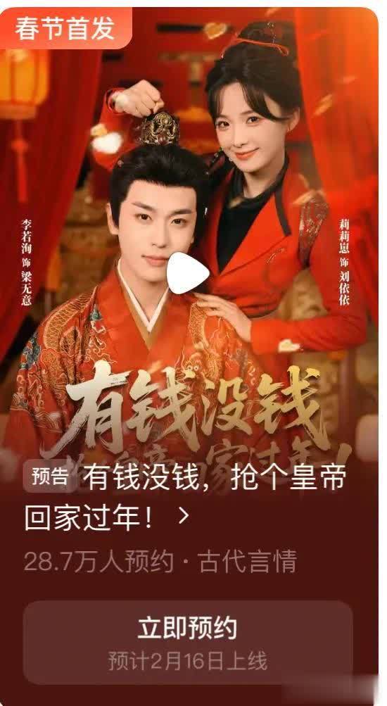 李若洵、莉莉崽主演的古风短剧《有钱没钱轻松配资炒股,抢个皇帝回家过年》正式官宣定档2月16日红果上线播出!